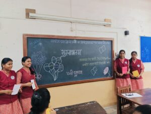 याप्रसंगी मा. मुख्याध्यापिका श्रीमती शुभांगी कांबळे मॅडम उपस्थित होत्या. इयत्ता १२वी अबोली मधील समीक्षा राऊत हिने उपस्थितांचे स्वागत, परिचय करून आभार मानले.
